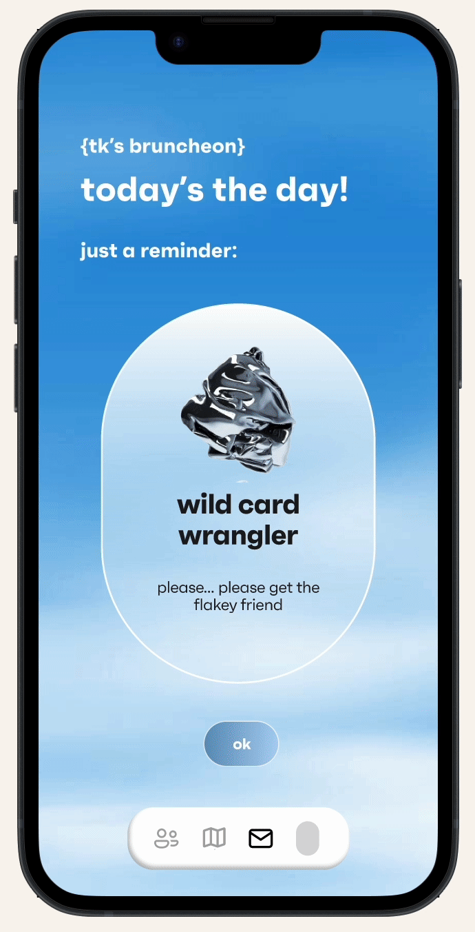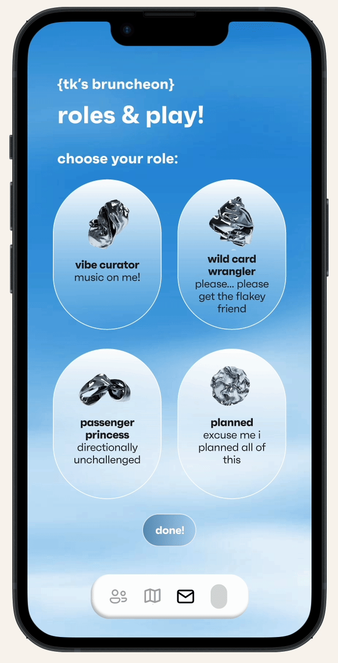 Tap any charm to check details, RSVP, or jump into your role — whether you're the Architect, the Bridge, or just along for the ride. Managing plans has never looked this cute.