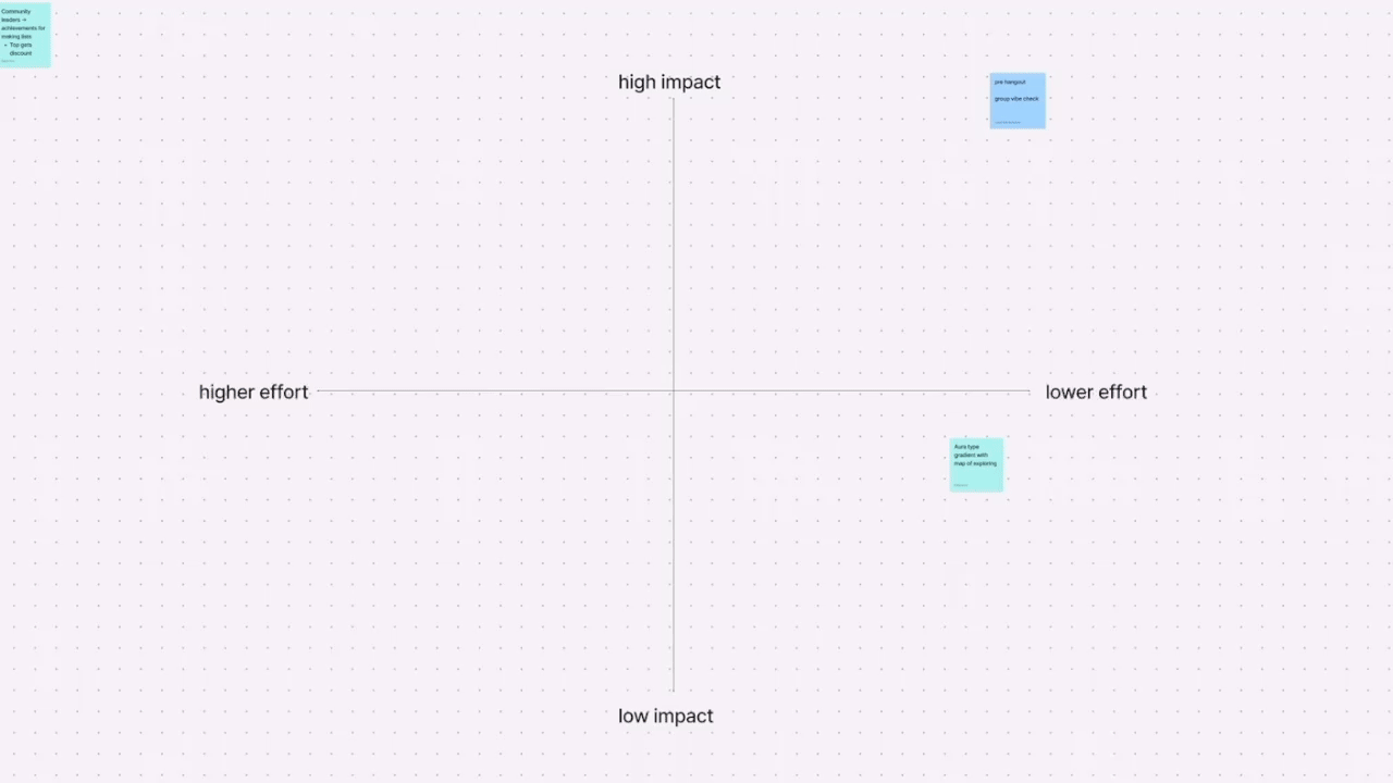 Next, to bring structure to our chaos, we plotted ideas on a 2x2 matrix based on user impact and user effort. This helped us quickly identify: