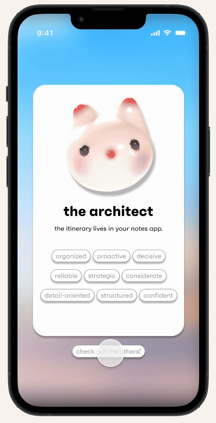 To make planning feel a little more playful, we’ll also introduce you to your Corner Buddy — an adorable companion that matches your archetype. Think of them as a mix between a mood booster and a gentle accountability partner. Easily view your archetype anytime by tapping your card — it's a fun snapshot of your planning style.